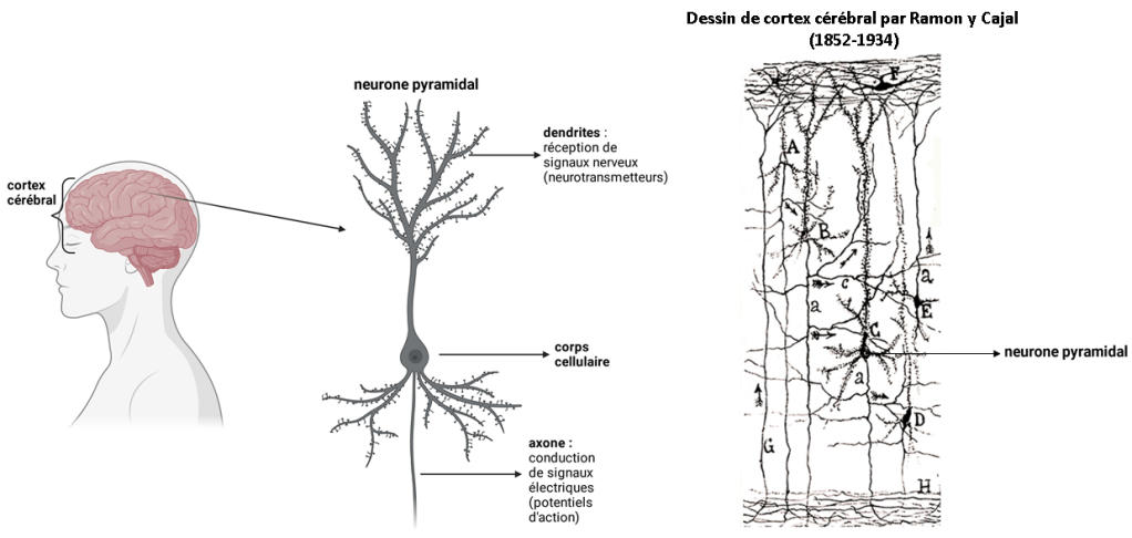 Figure 1 : Schéma d’un neurone pyramidal du cortex cérébral et dessin de cortex cérébral par Ramon y Cajal.