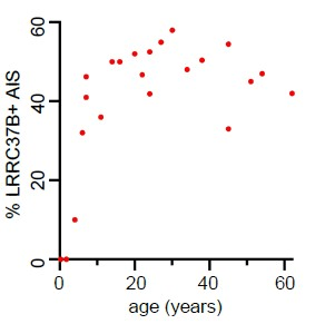 Figure 5 : Proportion de zones de gâchettes qui sont positives pour LRRC37B au cours de la vie. LRRC37B commence à s’exprimer au cours de l’enfance, pour atteindre une expression stable à partir de l’adolescence et ce, pour le reste de la vie. @Libé-Philippot et al., Cell