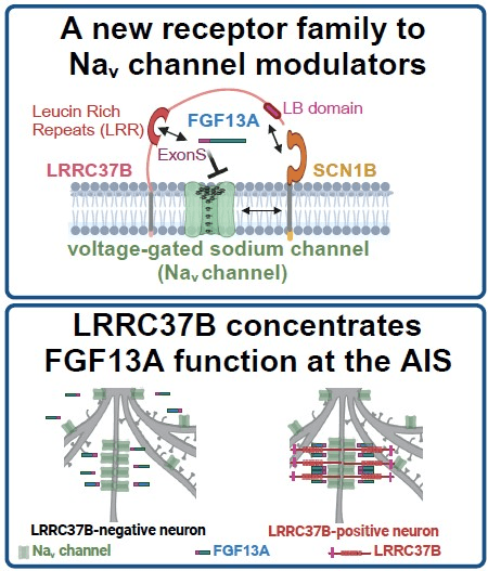 Jusqu’à ce jour, LRRC37B était un récepteur orphelin, c’est-à-dire que personne n’avait cherché ou trouvé les molécules qui se lient au récepteur. Par plusieurs approchent indépendantes, nous avons identifié deux molécules qui se lient à LRRC37B : une protéine sécrétée (FGF13A) et une autre protéine membranaire (SCN1B). Ces deux protéines agissent sur les canaux sodiques de la zone de gâchette (Figure 7) !