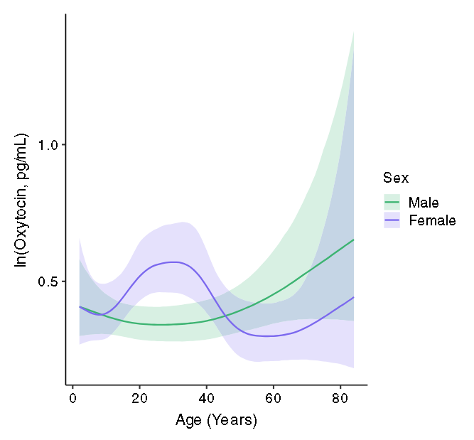 Les chercheurs ont observé que les niveaux d’ocytocine chez les femmes augmentent dès l’adolescence, atteignent un pic entre 20 et 40 ans, puis déclinent à la ménopause (Figure 2). Ce schéma correspond aux périodes de grossesse, d’allaitement et de soins aux enfants. Les résultats de cette étude suggèrent que l’allaitement augmente le taux d’ocytocine. En effet, les femmes qui allaitent ont des niveaux d’ocytocine significativement plus élevés que les autres. De plus, chez les femmes, même en dehors de l’allaitement, le fait de s’occuper d’enfants est associé à une augmentation de production d’ocytocine.