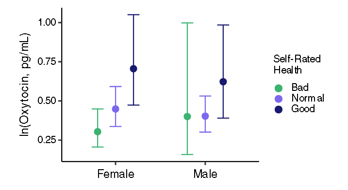 L’étude révèle que les personnes (hommes et femmes) qui déclarent être en bonne santé ont des niveaux d’ocytocine plus élevés (Figure 3). Ce lien entre ocytocine et santé n’est pas nouveau : des recherches antérieures ont montré que cette hormone réduit l’inflammation, favorise la cicatrisation et protège le cœur. Les auteurs émettent donc l’hypothèse que l’ocytocine pourrait aider à moduler les effets du vieillissement (maladies cardiovasculaires et neurodégénératives), ce qui expliquerait l’augmentation du niveau d’ocytocine avec l’âge et une meilleure santé. Une piste pour privilégier la confiance et les interactions sociales en vue d’un meilleur vieillissement ?